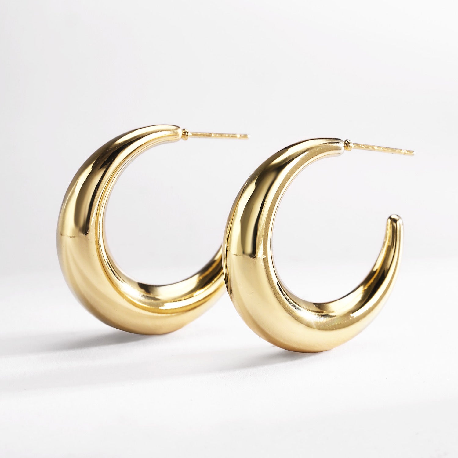 Add a touch of elegance to your outfit with our 18k gold plated hoop earrings. Made with high-quality materials, these earrings are perfect for any occasion. The gold plating provides a beautiful shine that will elevate your style and make you stand out. A must-have accessory for every jewelry collection.