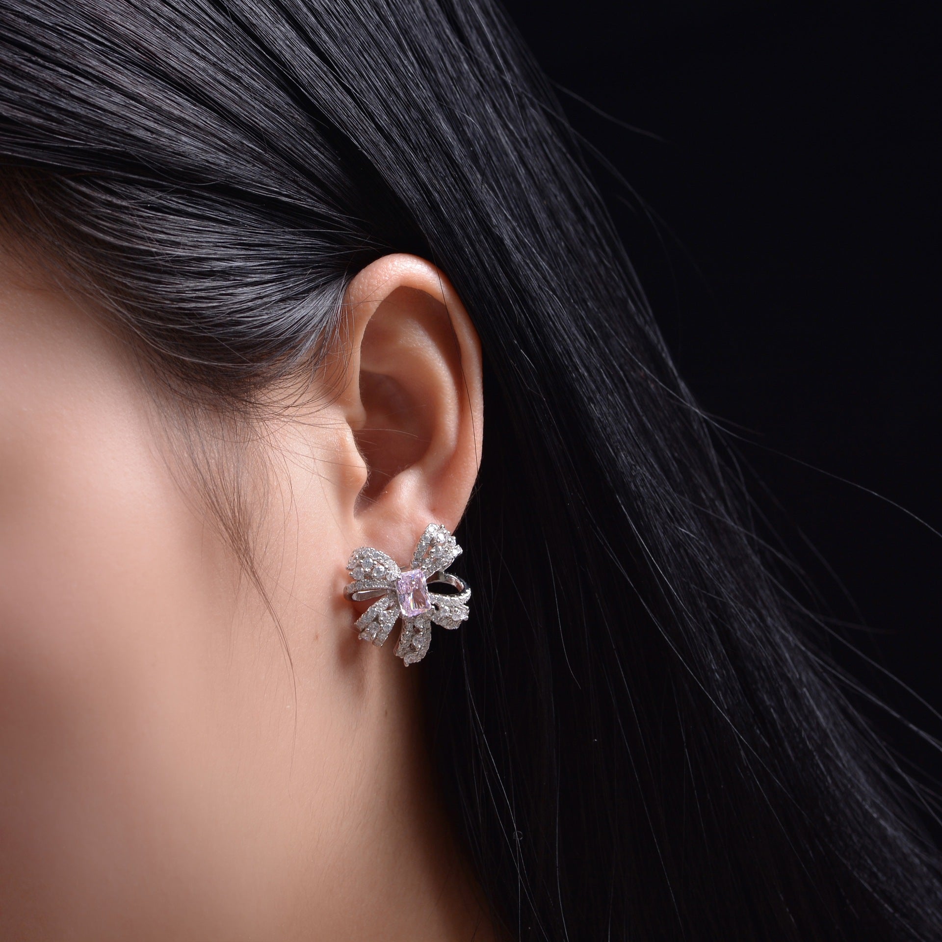 These sterling silver earrings feature a stunning 1-carat rectangular frosted cut high-carbon diamond, measuring 5x7mm. Designed with a delicate bow motif, they combine elegance and charm, making them perfect for women who appreciate refined and timeless jewelry. The high-carbon diamond adds brilliance and durability, giving you a lasting sparkle to complement any outfit.