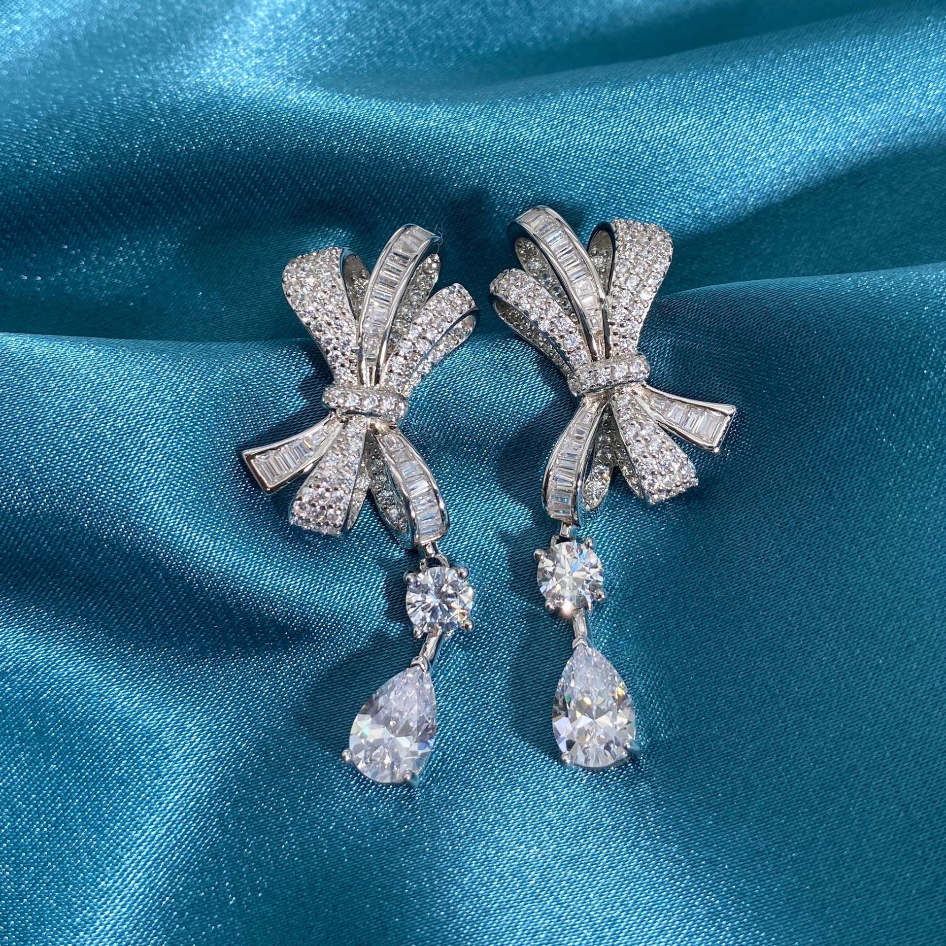 These S925 sterling silver bow earrings showcase a 1-carat pear-cut center stone (6x9mm) surrounded by a luxurious full pavé diamond setting. Designed in the popular Euro-American live stream style, they combine elegant sparkle with modern charm, perfect for adding a graceful touch to any look. Comfortable and eye-catching, these earrings are a stunning choice for special occasions or everyday elegance.