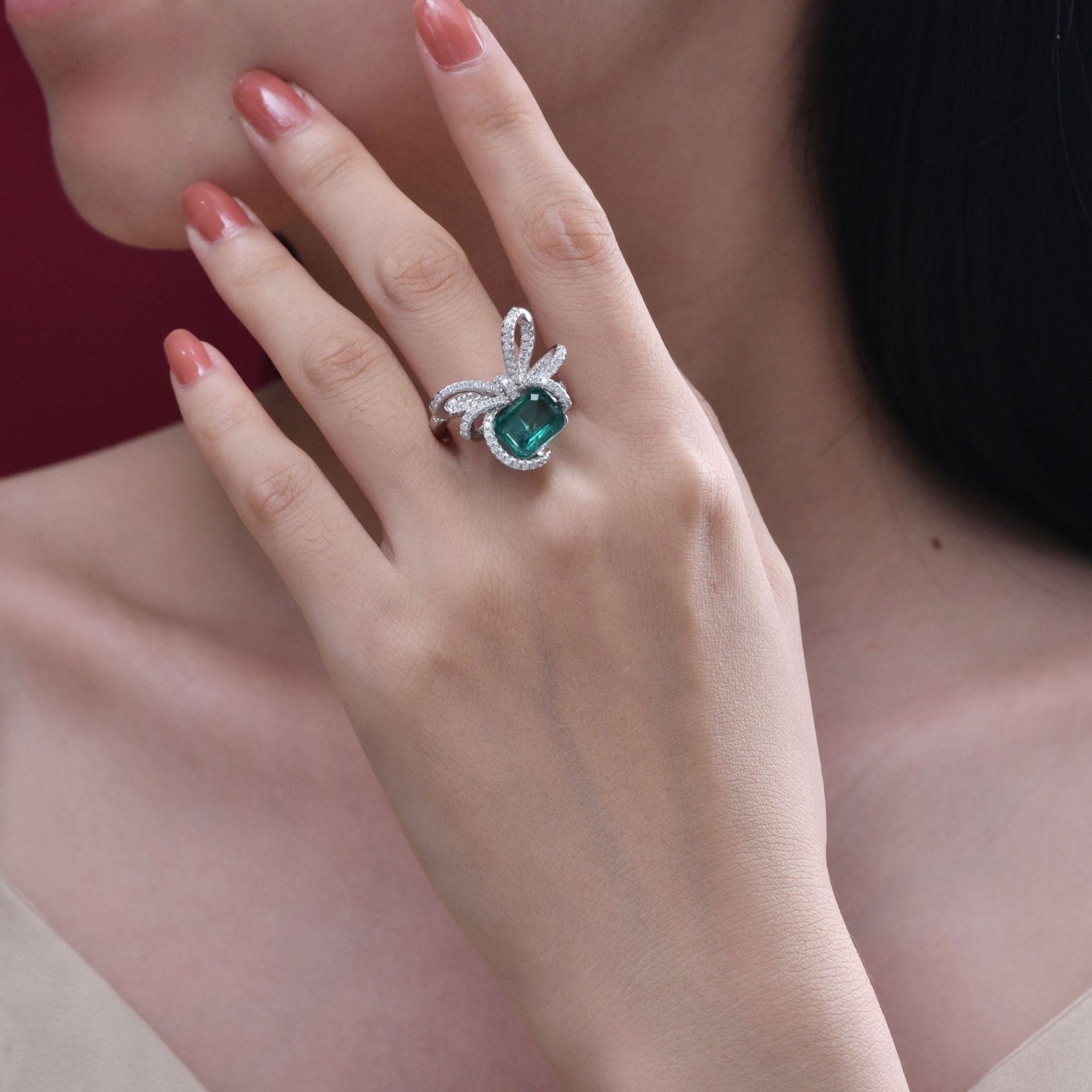 2.35 Carat Emerald-Cut Lab Emerald Ring – Bowknot Design, Minimalist Romantic Style
