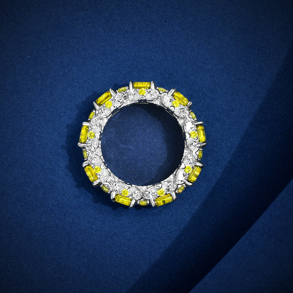 This sterling silver eternity band showcases square 5x5mm pagoda-cut golden high-carbon diamonds totaling 0.8 carats. Designed for a radiant and continuous sparkle, itβs available in US sizes 6 through 10 to ensure a comfortable fit. Perfect for adding timeless elegance to any outfit or special moment.